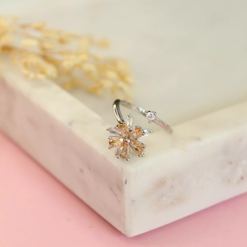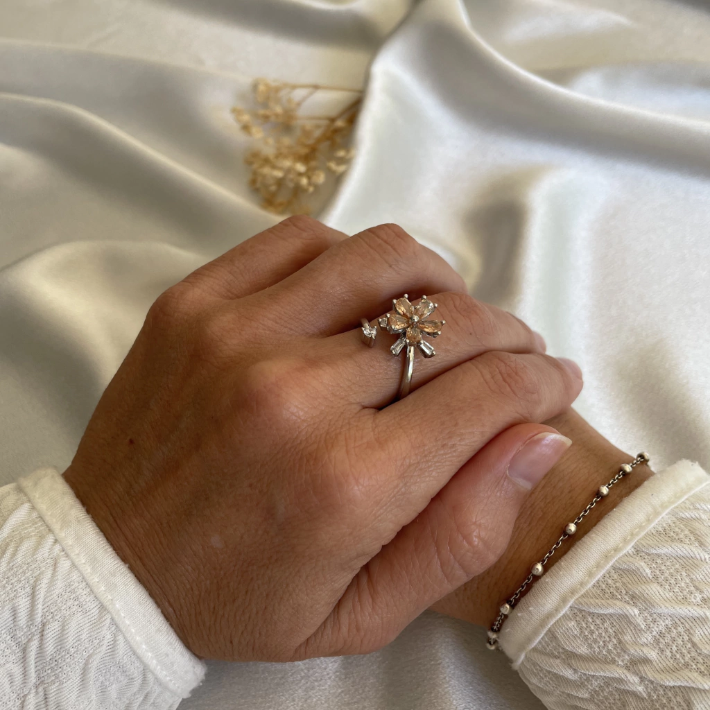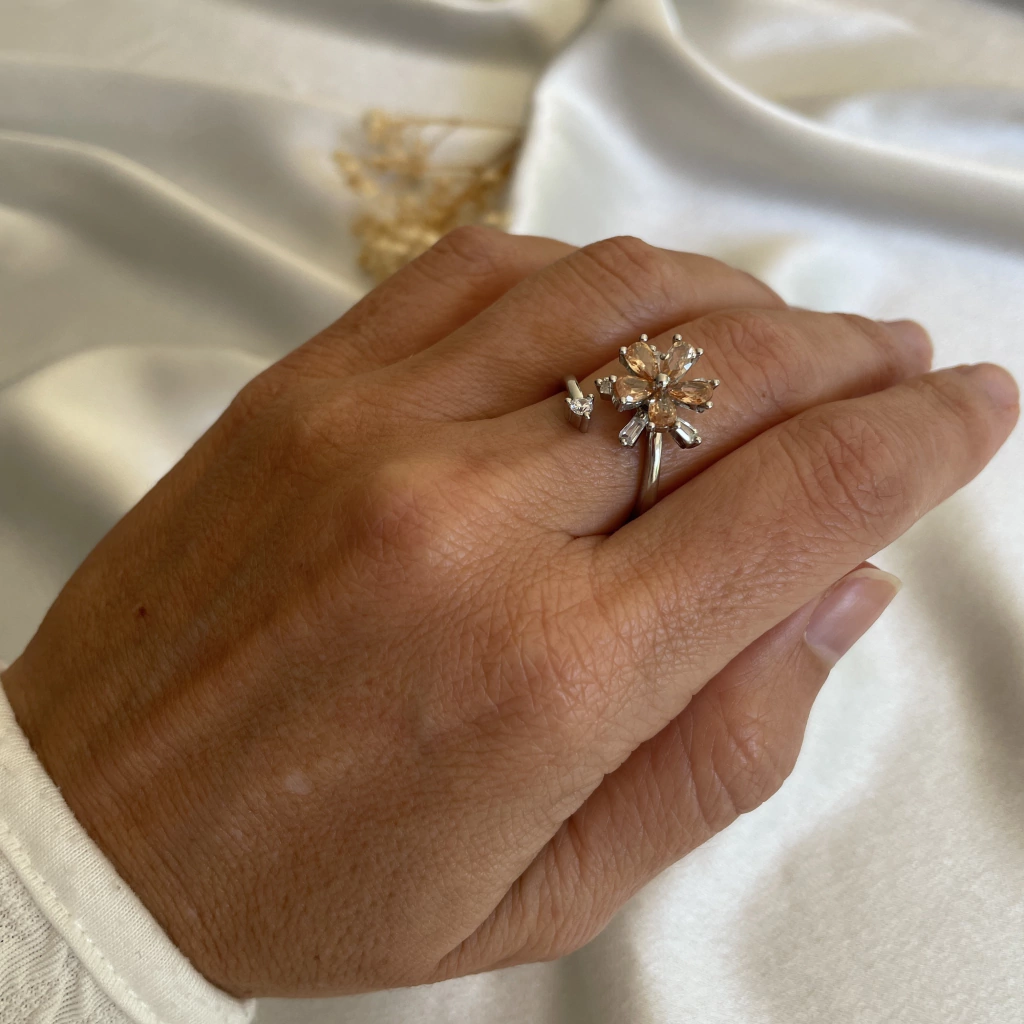 Diseño de flor con piedras circonitas color durazno y blancas brillantes. Giratorio. Regulable.