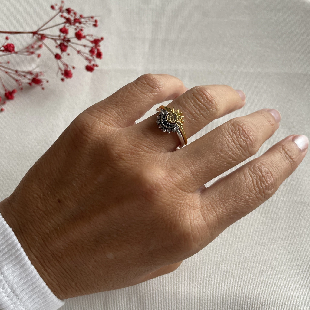 Diseño de dos anillos combinados de Sol y Luna con circonitas.