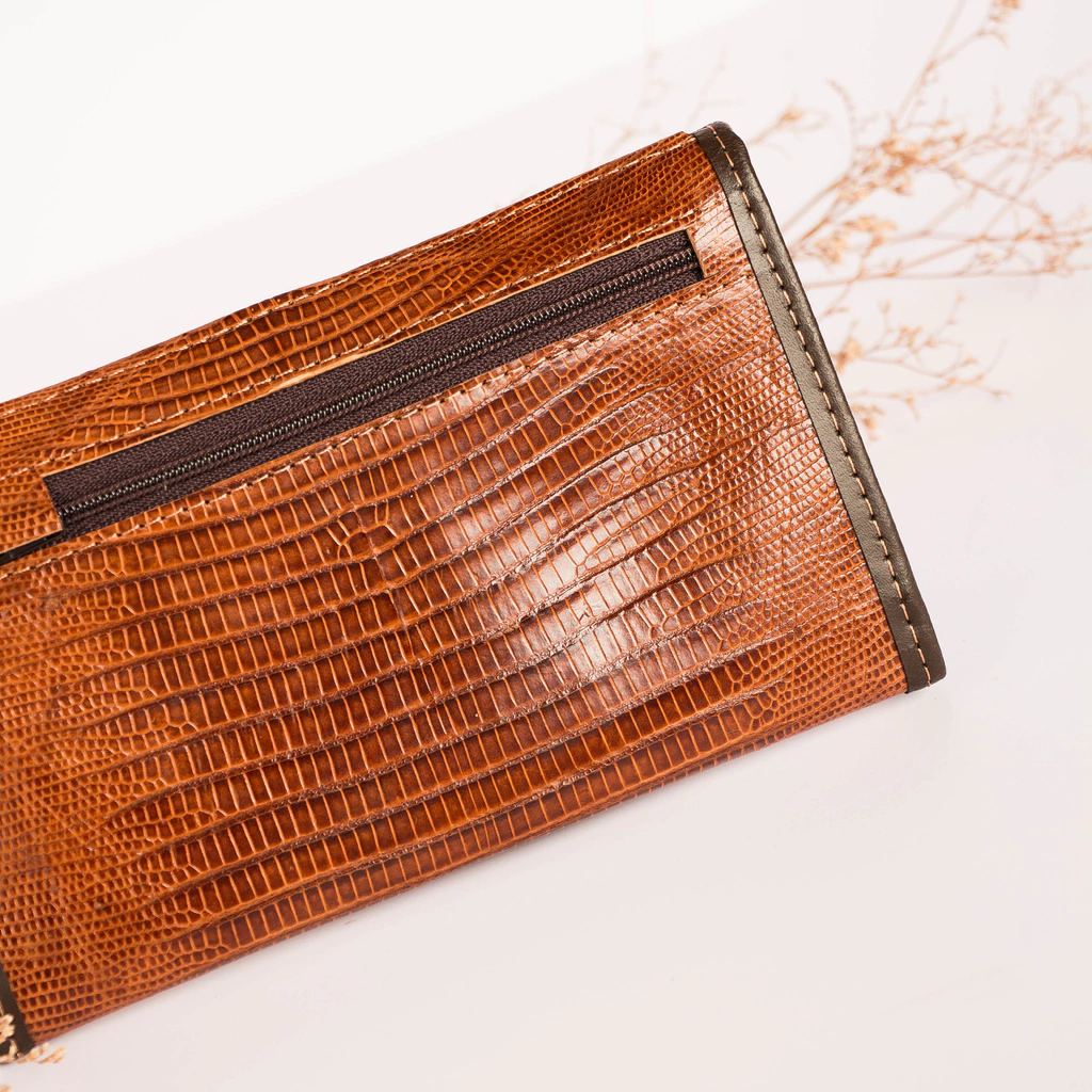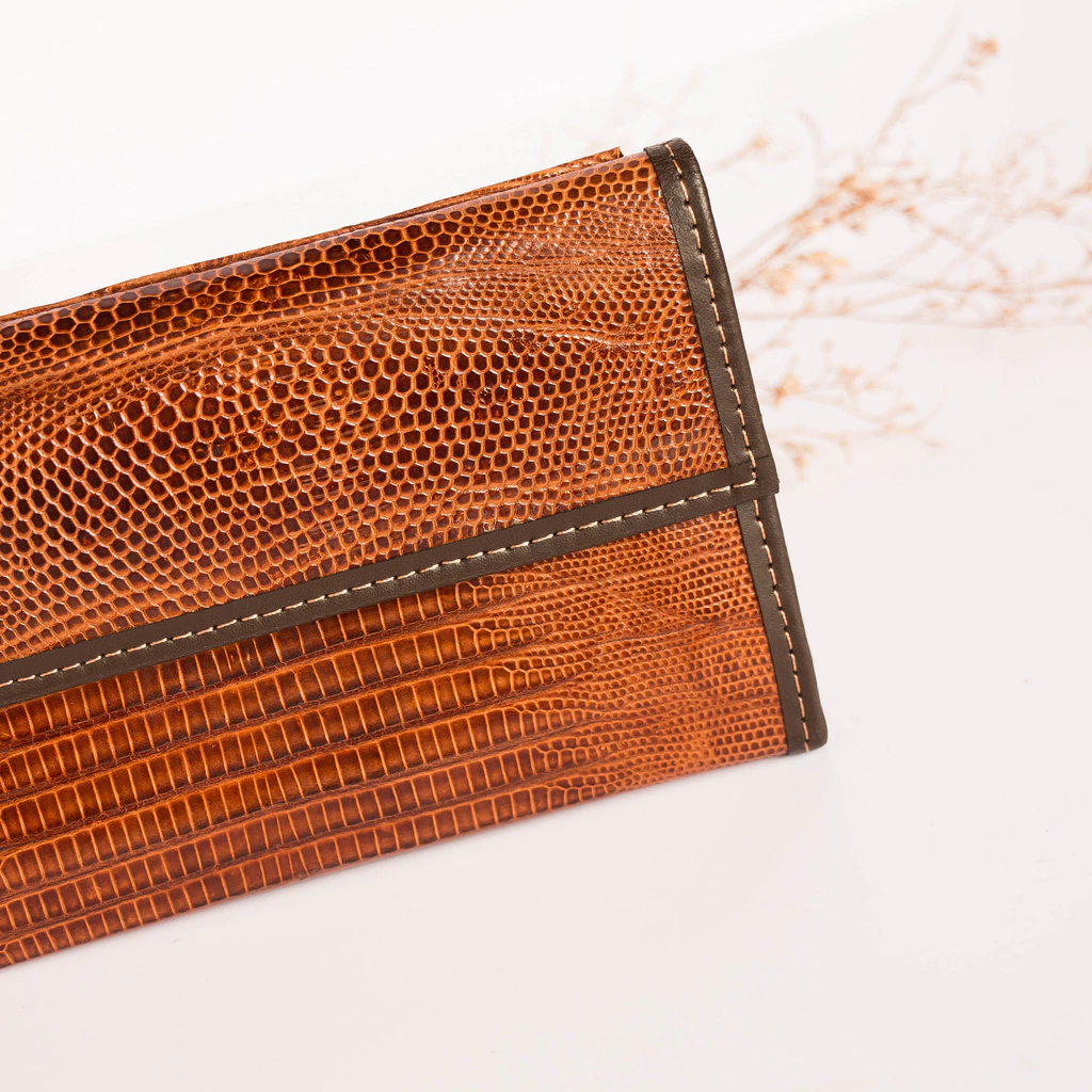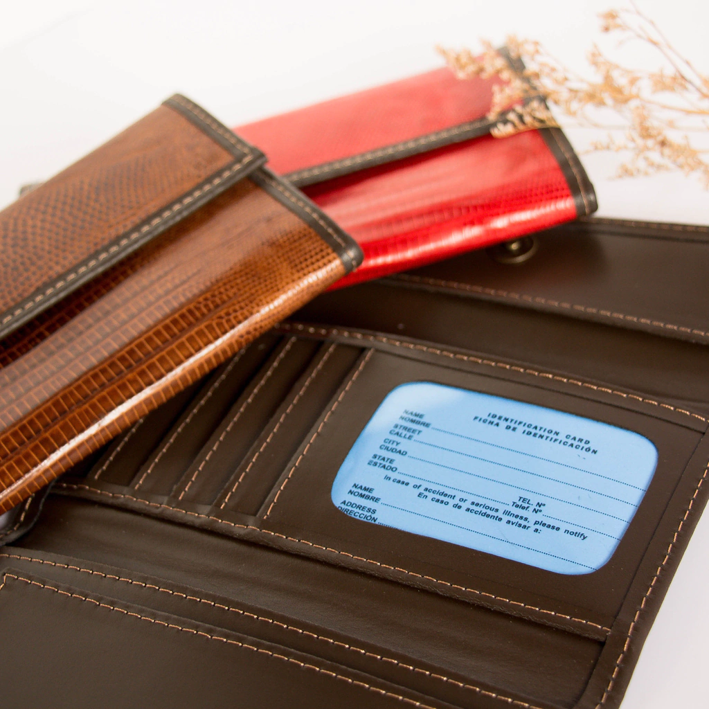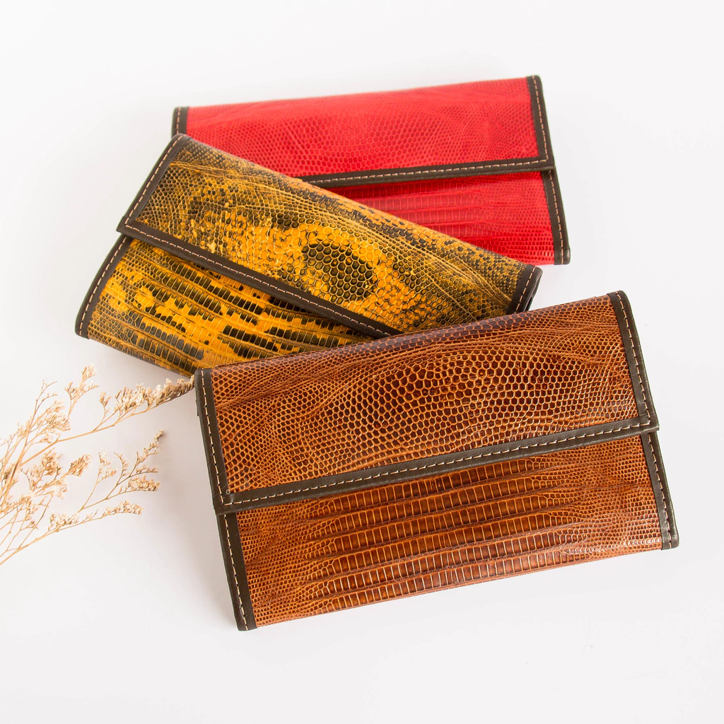 Billetera tipo fichero triple con solapa. Combinana con cuero de iguana en su exterior y vacuno en su interior. Broche a presión y cierre exterior. Compartimientos para tarjetas de crédito y credenciales.