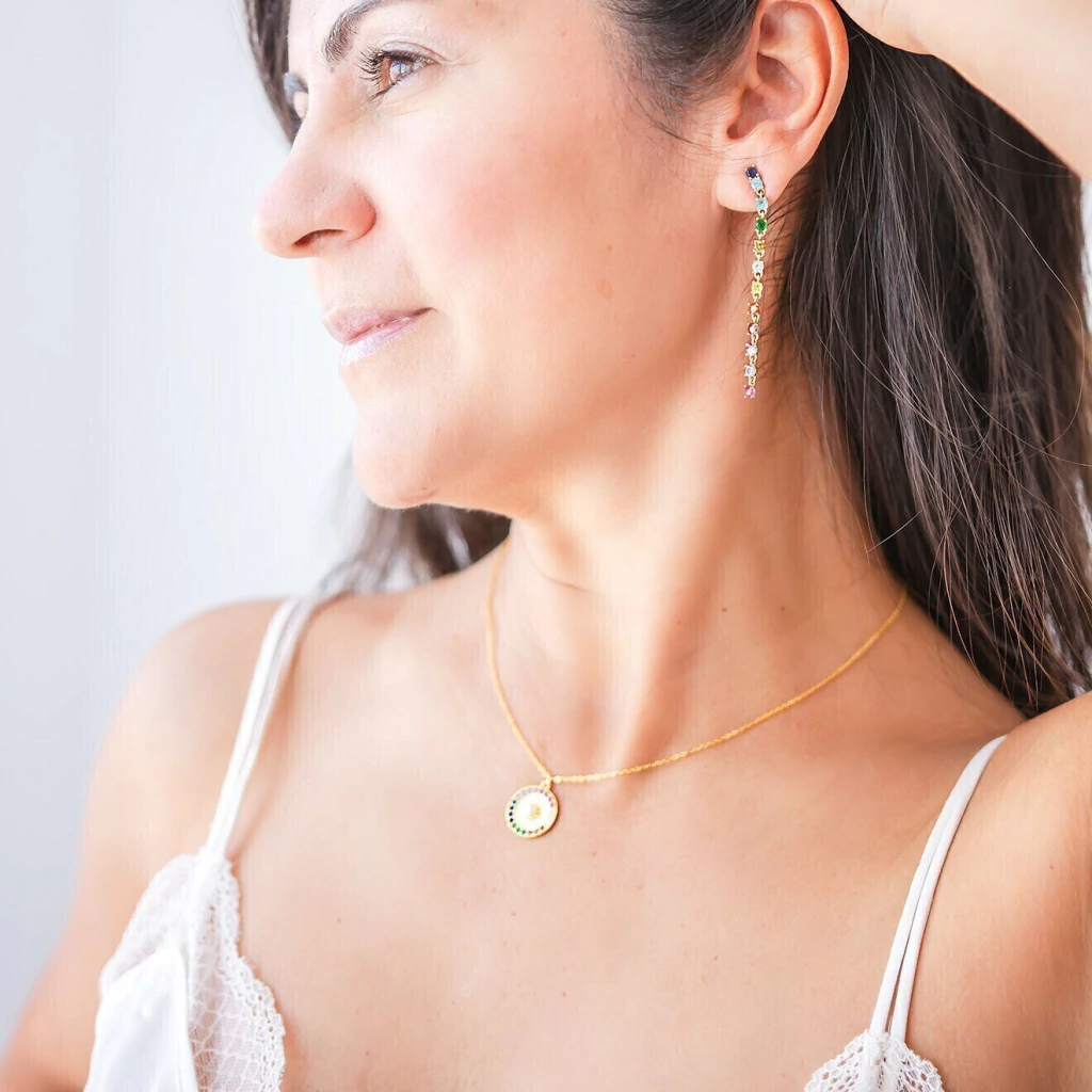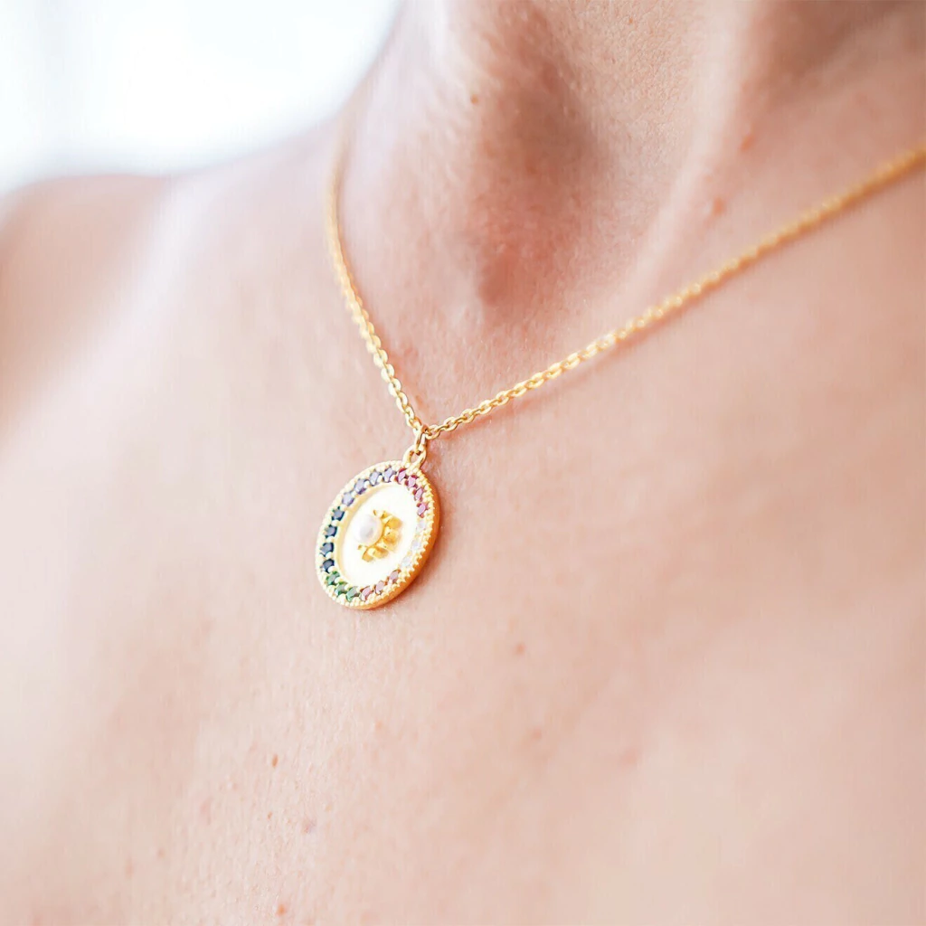Diseño con dije de circonitas multicolores y perla blanca de rio. Regulable hasta 42 cm.