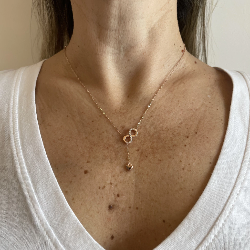 Diseño estilo corbatero, con dije Infinito con circonitas y corazón en el extremo. Con tres posiciones de enganche, regulable hasta 48 cm.