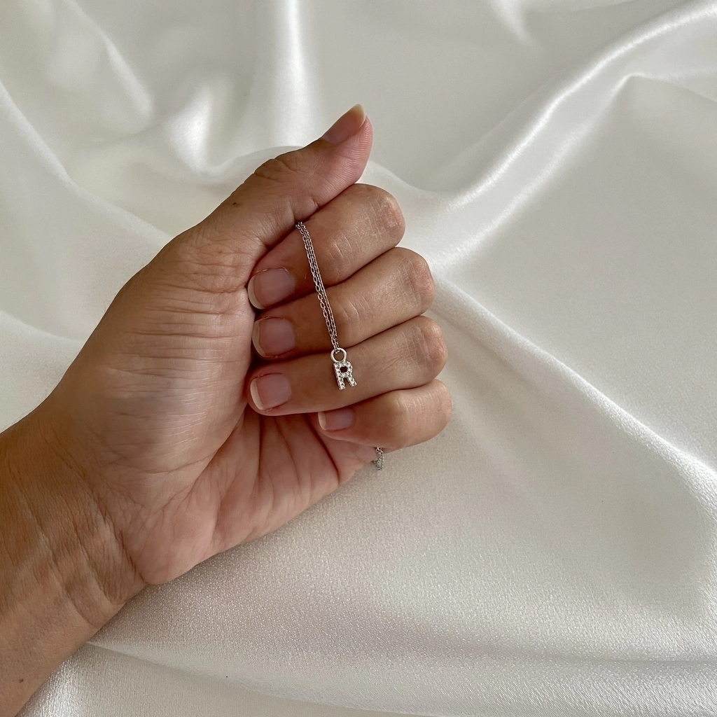 Diseño con dije de letra "R" con circonitas. Conjunto hasta 41 cm.
