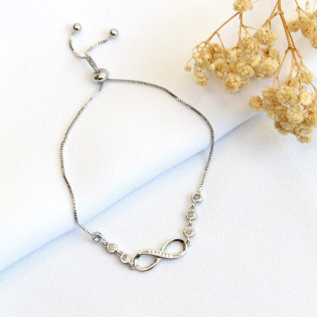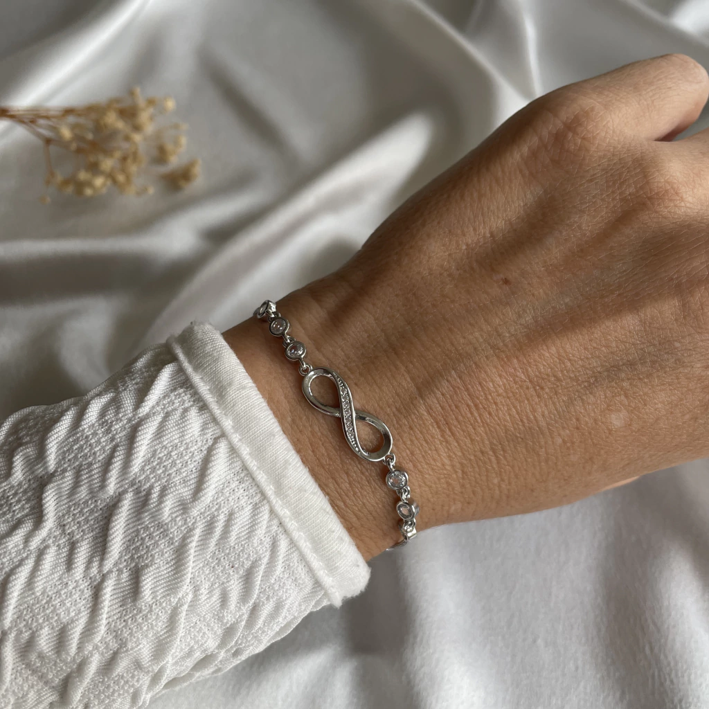 Diseño con dije infinito con circonitas blancas y eslabones circulares con circonitas blancas. Regulable hasta 24 cm.
