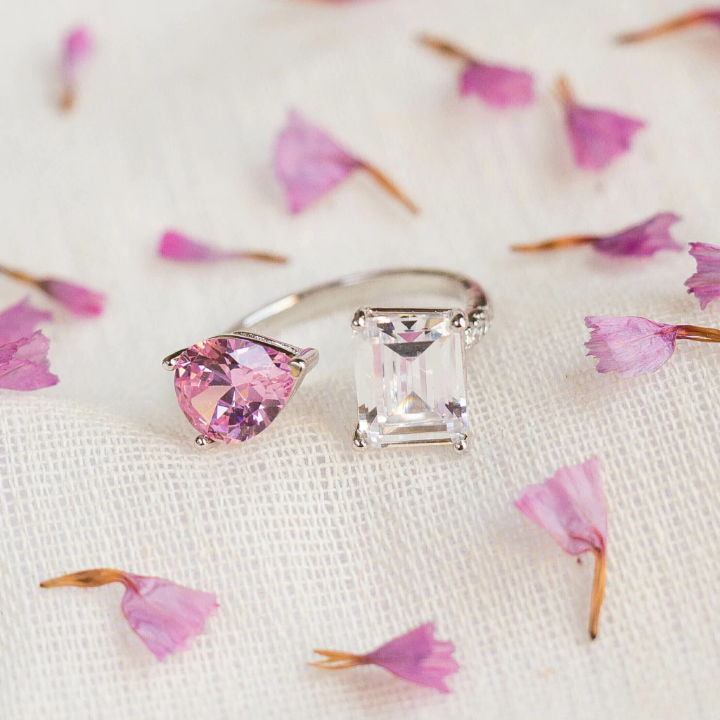 Diseño con piedras de circonitas color rosado y blanco y micropavé en laterales.