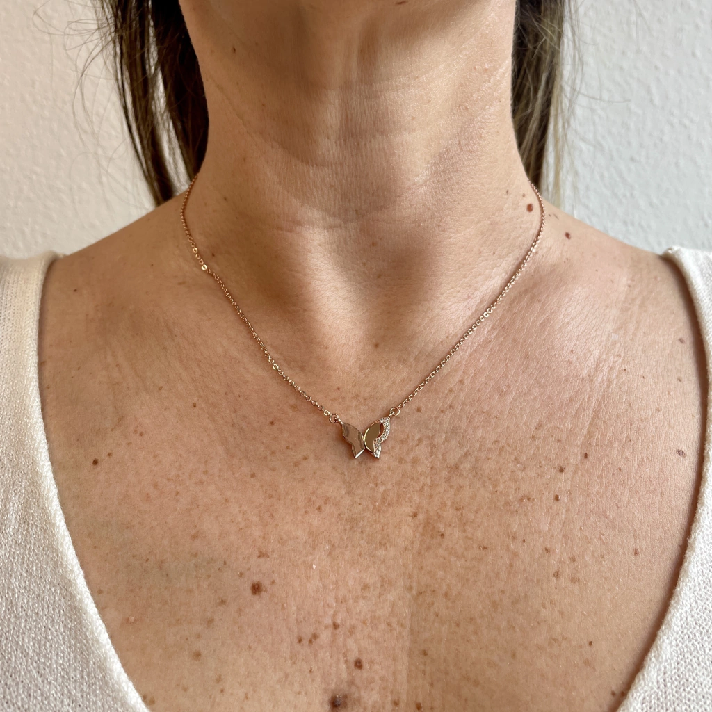 Diseño de mariposa con circonitas blancas. Regulable hasta 40 cm.